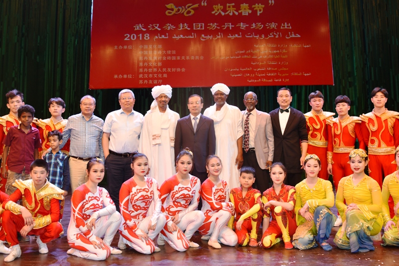 裴永宏(后排左起第 4 位)参加在苏丹首都喀土穆举办的 2018 “欢乐春节”武汉杂技团专场演出