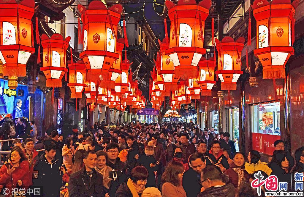 2018年2月17日,夜幕下,上海豫园狗年新春民俗艺术灯会流光溢彩,年味十足,吸引众多市民和游客观灯游园,感受喜庆的节日气氛。视觉中国