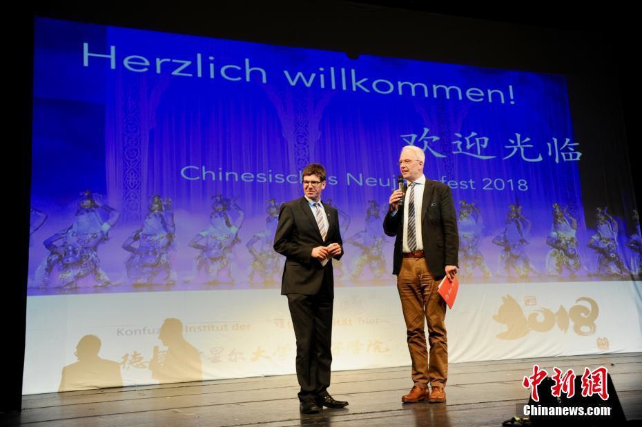 当地时间2月26日晚,特里尔大学孔子学院在当地主办了一场别开生面的春晚,让马克思故乡德国特里尔热闹非凡。图为特里尔市长和特里尔大学校长致辞。中新社记者 彭大伟 摄