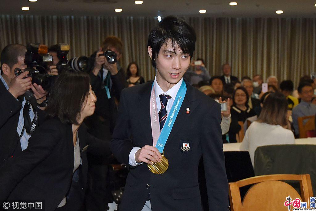 2018年2月27日,日本东京,羽生结弦冬奥回国行程繁忙,出席发布会笑容灿烂。Kyodo News/视觉中国