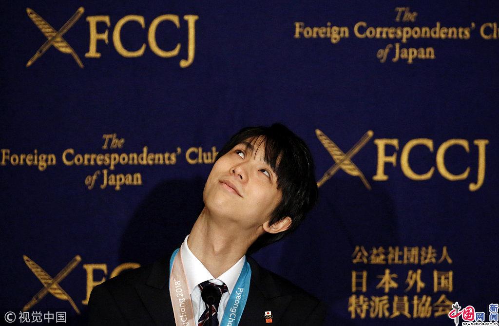 2018年2月27日,日本东京,羽生结弦冬奥回国行程繁忙,出席发布会笑容灿烂。Kyodo News/视觉中国