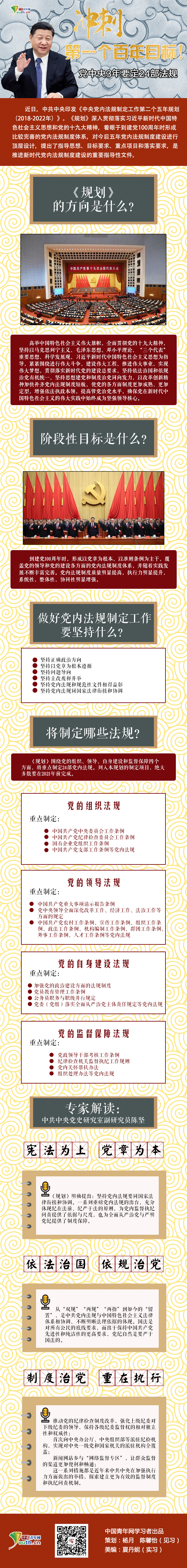 近日,中共中央印发《中央党内法规制定工作第二个五年规划(2018-2022年)》。《规划》深入贯彻落实习近平新时代中国特色社会主义思想和党的十九大精神,着眼于到建党100周年时形成比较完善的党内法规制度体系,对今后五年党内法规制度建设进行顶层设计,提出了指导思想、目标要求、重点项目和落实要求,是推进新时代党内法规制度建设的重要指导性文件。