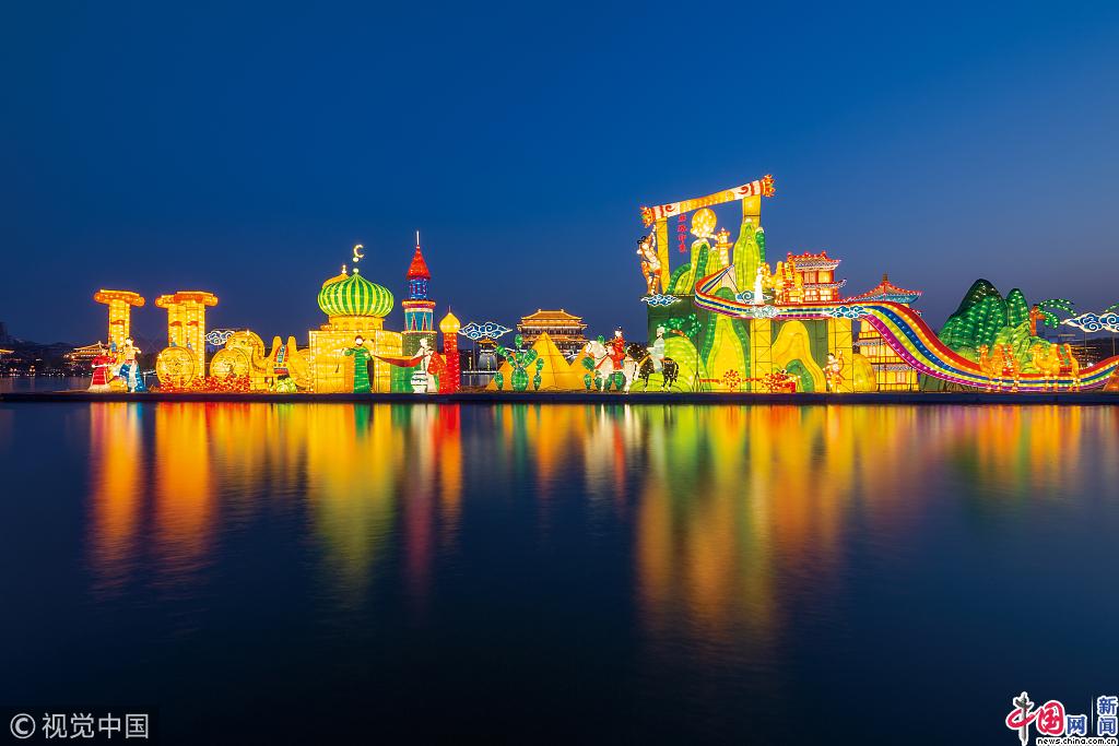2018年2月25日,西安。绚丽花灯与亭台楼阁,厚重历史与现代潮流,烟波浩渺的芙蓉湖畔,能工巧匠的精心制作,重现大唐上元灯节盛况。视觉中国