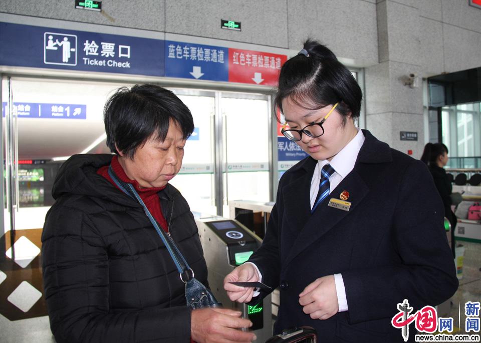 工作中的边敏,为只身出行的老年旅客答疑解惑。