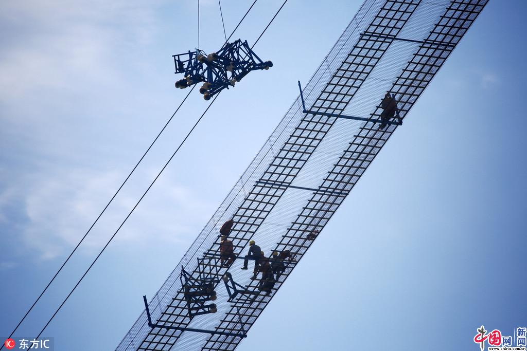 2018年3月11日下午,建桥工人正在浙江省舟山市岱山县秀山大桥施工猫道上进行最后的防滑木条加固、两侧防护网和栏杆扶手等安装施工,猫道架设施工将于今天(12日)完成。姚峰/东方IC
