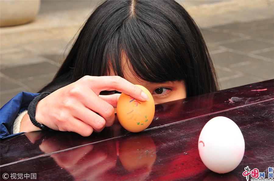 2018年3月20日,山东济宁,众多游客在工作人员的引导下做“立蛋”游戏,共同迎接春分的到来。(徐飞/视觉中国)