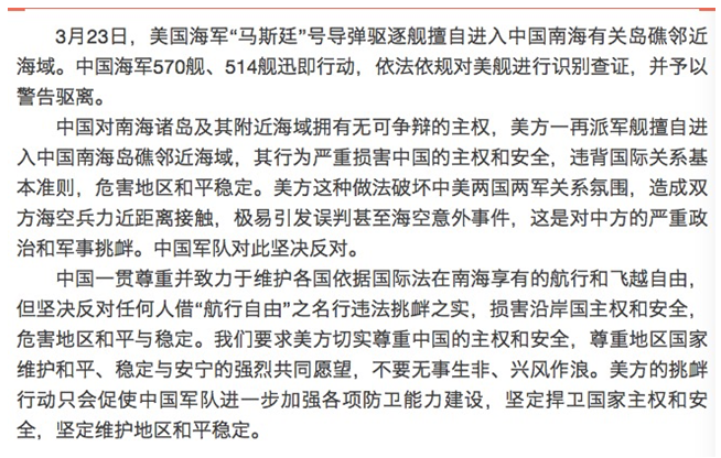 针对23日美驱逐舰闯入我美济礁12海里,国防部在当天做出一份堪称史上最严厉的声明:称这是对中方的严重政治和军事挑衅。这需要美方能读懂此次中国军方声明和以往不同的涵义。