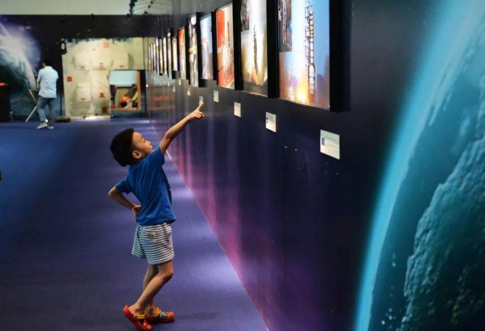 2017年7月26日“中国梦?航天梦——首届中国航天员飞天摄影作品展”在京举行。在北京天文馆,一名小朋友在摄影展上参观。新华社记者 王化娟 摄