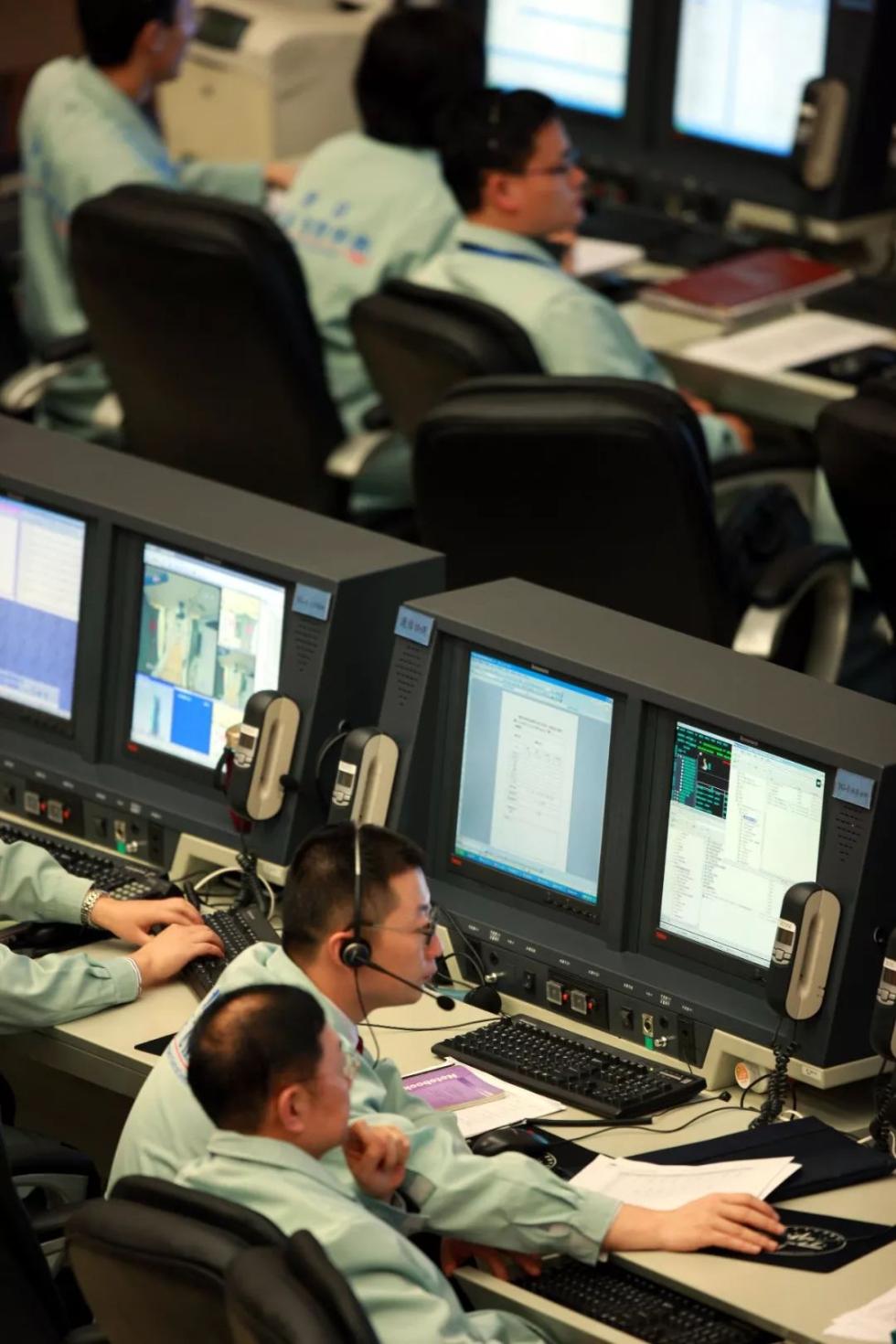 2011年11月3日凌晨,在酒泉卫星发射中心指控大厅,技术人员通过大屏幕观看天宫与神八对接全程。