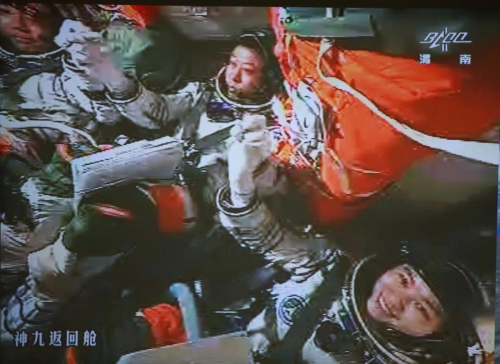 2012年6月18日,神九航天员景海鹏、刘旺、刘洋全部进入天宫一号实验舱内(视频截图)。新华社发