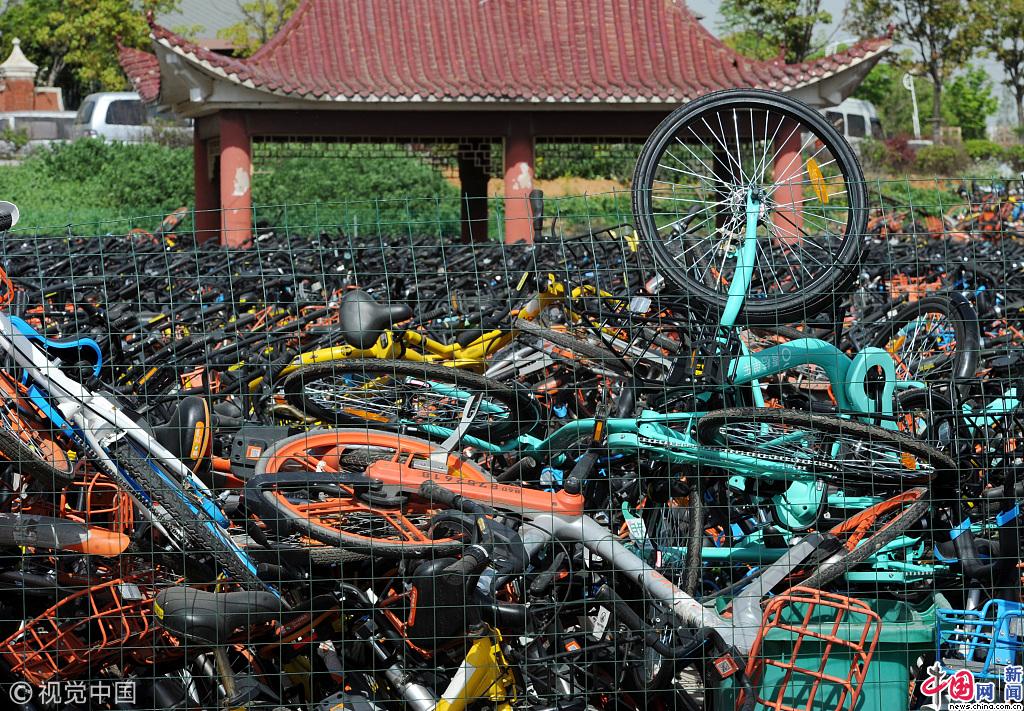 2018年4月7日,武汉,空地上堆满了万辆共享单车。(吴铭/视觉中国)
