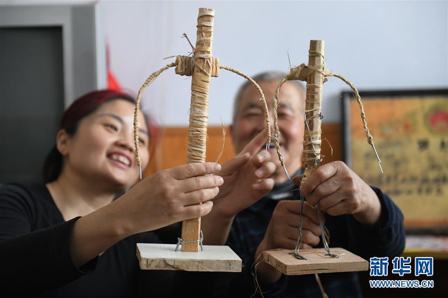井陉泥塑代表性传承人张成兵(右)和女儿展示泥塑的“骨架”(3月13日摄)。近年来,河北石家庄市级非遗井陉泥塑代表性传承人张成兵致力于创作《西游记》主题泥塑作品,目前已完成作品近百尊,以传统技艺再现经典形象。新华社发(陈其保 摄)
