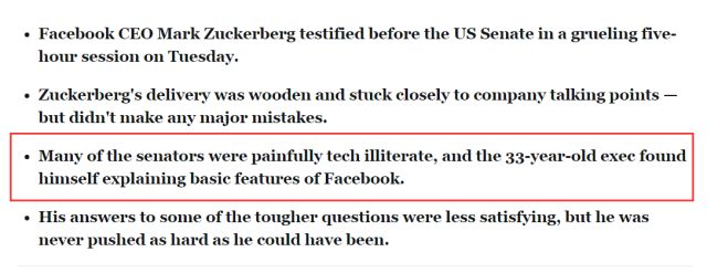 接下来再说负面的例子:在“公审”扎克伯格的近百名美国国会议员中,这些平均年龄61岁的政客其实有很大一批人根本连Facebook等社交网站的基本操作常识都不了解,因此他们居然提出了一些诸如“Facebook既然是免费的,那么靠什么盈利”这种很幼稚的问题。
