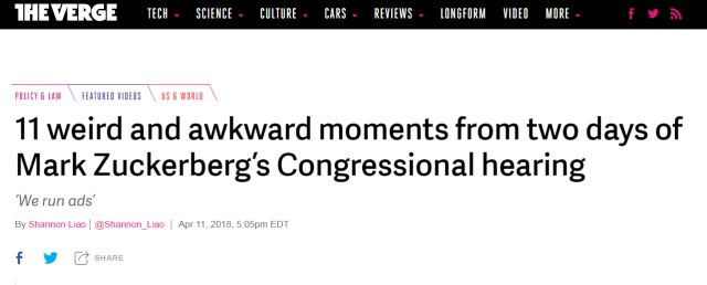 当然,美国国会里也有一些确实比较懂网的国会议员,从技术和法律层面提出了不少让扎克伯格很头疼的问题,但因为每个议员只有5分钟的“讯问”时间,结果这些问题也未能很好地展开,就被扎克伯格“躲”过去了……。