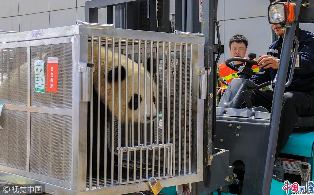 2018年4月19日,呼和浩特市,大熊猫“仨儿”和“茜茜”从成都大熊猫繁育研究基地安全抵达呼和浩特市,开始了她们在呼和浩特市大青山野生动物园为期3年的科普教育活动。这是国宝大熊猫首次定居呼和浩特市。供图:视觉中国