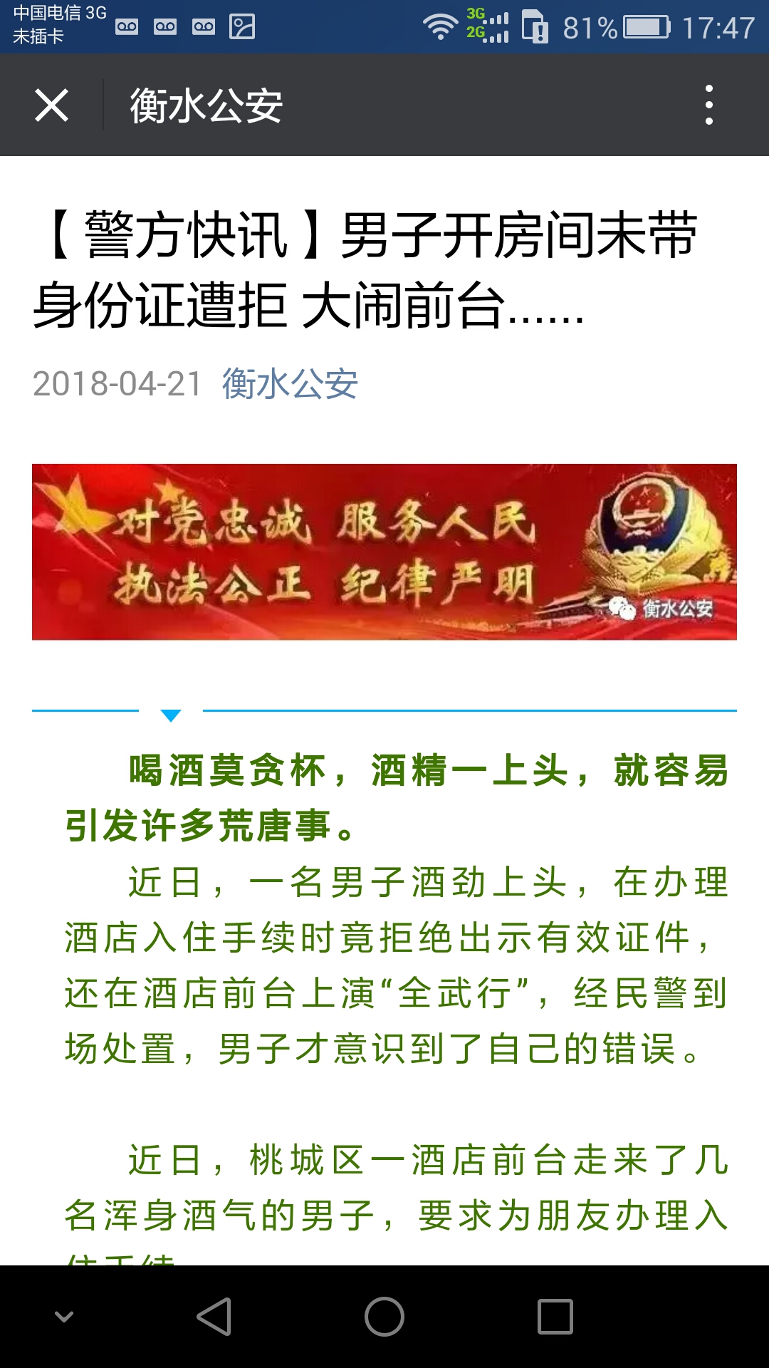 4月21日,衡水市公安局通过官方微信“衡水公安”通报,近日,衡水市桃城区一酒店前台走来了几名浑身酒气的男子,要求为朋友办理入住手续。
