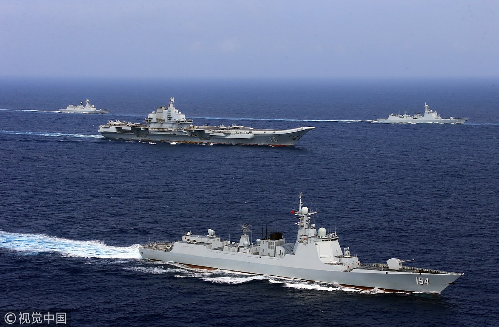 2018年4月20日,数架歼-15舰载战斗机先后前出,与辽宁舰航母编队属舰密切协同,对“蓝方”舰艇实施精确打击,舰载战斗机在西太平洋海域开展舰基空海对抗训练。驰骋大洋的航母编队。(张雷/视觉中国)