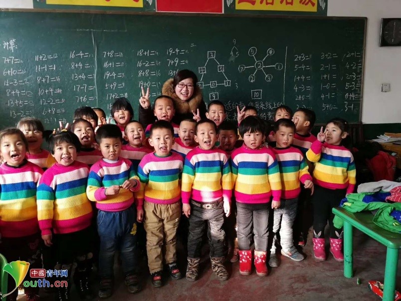 刘晓卿和其他支教老师一起为学生们筹集衣物,图为刘晓卿与穿上新衣服的学生们合影。受访者供图