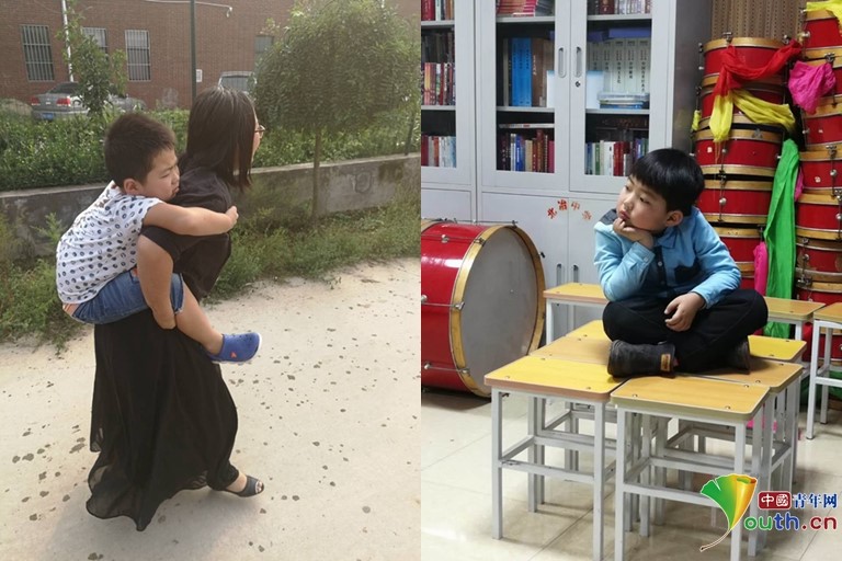 刘晓卿与儿子淡淡在一起,右为淡淡坐在北冶中学的音乐教室内。受访者供图