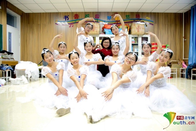 舞蹈兴趣班的同学们表演结束后,刘晓卿和女孩们合影留念。中国青年网记者孙钊 摄