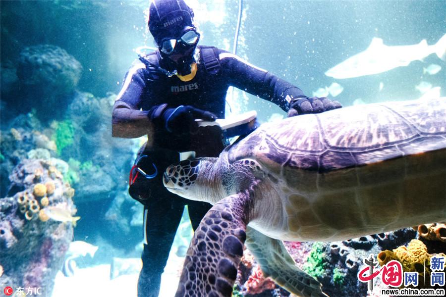 当地时间2018年5月2日,在德国蒂门多尔费尔-斯特兰德,潜水员Oliver Volz给绿海龟Speedy“洗澡”。Frank Molter/东方IC