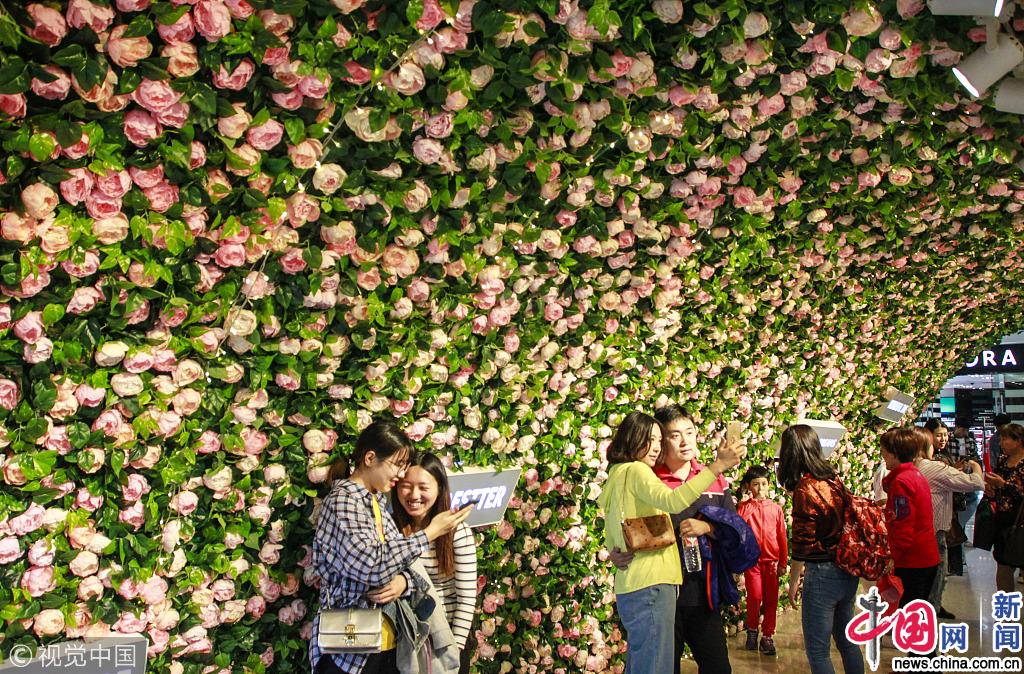 2018年5月5日,辽宁沈阳。一大型商场别出心裁,一巨大拱形通道内镶满玫瑰花,行走在拱形通道内,如置身于烂漫的花海中,引逛街市民争相拍照留念。