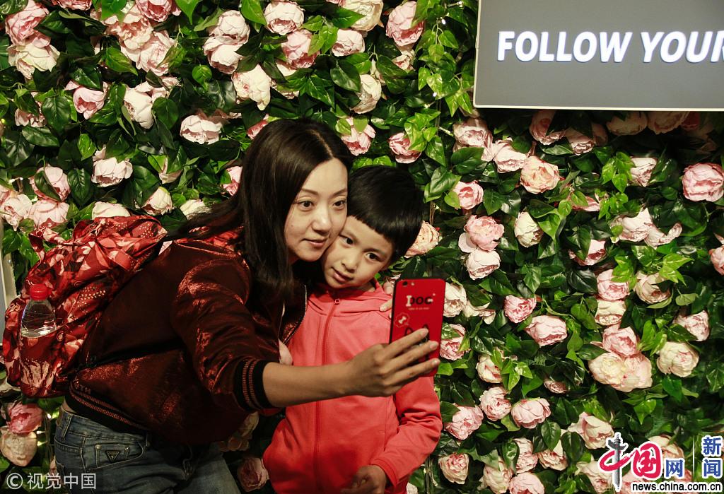 2018年5月5日,辽宁沈阳。一大型商场别出心裁,一巨大拱形通道内镶满玫瑰花,行走在拱形通道内,如置身于烂漫的花海中,引逛街市民争相拍照留念。