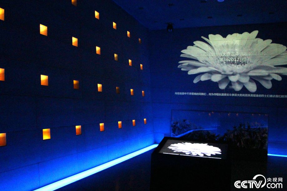“5·12”汶川特大地震纪念馆,参观者在电子屏幕前点击按钮向地震遇难同胞献花祭奠。