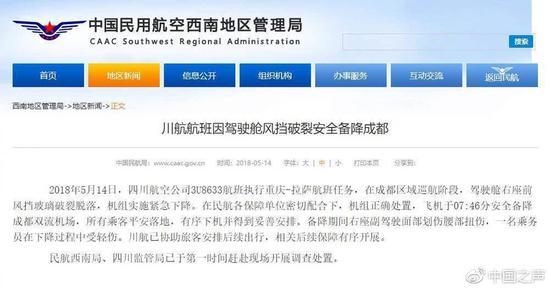 5月14号上午7:00多,川航由重庆飞拉萨的3U8633航班飞行途中挂出7700紧急情况代码,中途备降成都。之后,中国民航西南地区管理局在网站证实,3U8633航班在成都区域巡航阶段,驾驶舱右座前风挡玻璃破裂脱落,机组实施紧急下降。在民航各保障单位密切配合下,机组正确处置,飞机于07:46分安全备降成都双流机场,所有乘客平安落地,有序下机并得到妥善安排。备降期间右座副驾驶面部划伤腰部扭伤,一名乘务员在下降过程中受轻伤。受此影响,双流机场采取单跑到运行。