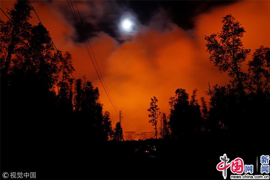 当地时间2018年5月26日,美国夏威夷火山持续喷发,熔岩照亮夜空。夏威夷火山观测站称,基拉韦厄火山峰顶的火山口26日不断喷发,火山灰直冲3353米高空,给位于火山西南部的村落蒙上一层灰。MARCO GARCIA/视觉中国