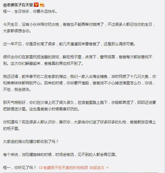 这个月,还是受害者、大儿子林柽一的生日月。林生斌同样在微博写了很长一段话。他问柽一:“大家送的指尖陀螺你都收到了吗?有个传说,当陀螺旋转的时候,时间会倒流,见不到的人都会再见面。”林生斌说,民事诉讼即将开始,他希望生命的代价,能唤醒大家对高层住宅消防的重视。