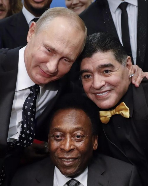 2017年12月1日,普京在2018年世界杯分组抽签仪式上与两代球王合影。