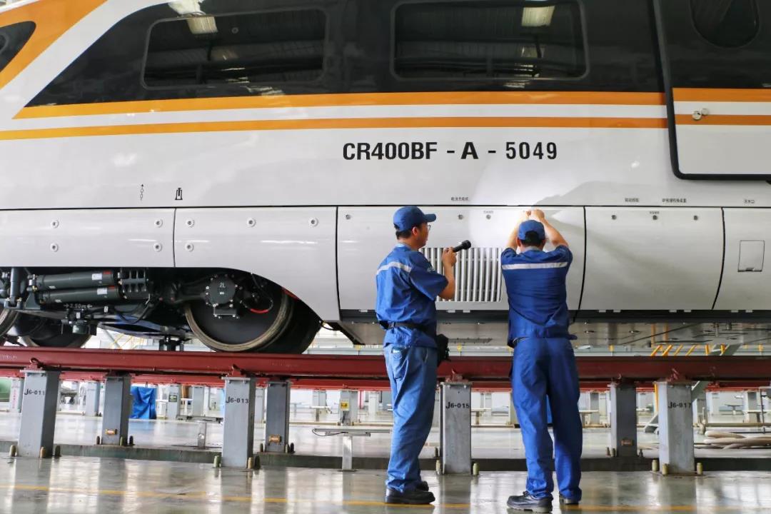 △技术人员正在对到达的长编组列车进行整修,验证动车组相关参数,检查各系统功能,以确保上线列车运行安全。