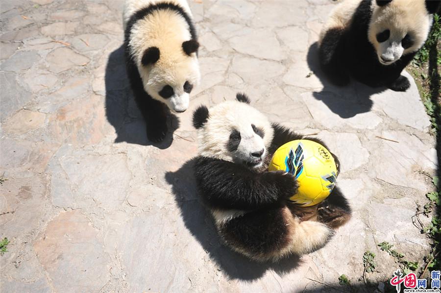 2018年6月5日,四川阿坝,两只熊猫宝宝正在玩足球。(中国大熊猫保护研究中心/视觉中国)