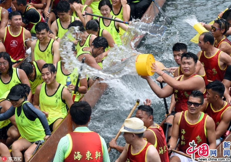 2018年6月18日,端午节,最具传统渔港特色、逾百年历史的香港仔龙舟竞渡大赛在香港仔避风塘举行。 据悉,今年共有33场赛事,包括大龙及中龙竞技,而参赛的龙舟健儿亦互相泼水助庆,水花四溅,气氛热烈。mayokyo/东方IC