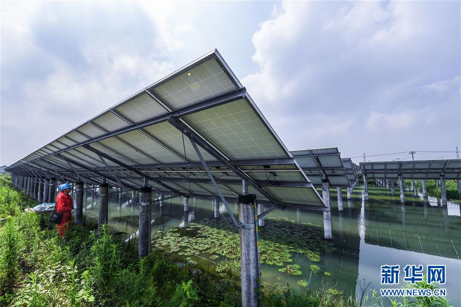 浙江省湖州市和孚镇的“渔光互补”光伏发电项目建设在4200多亩鱼塘上,40多万块太阳能光伏板下养殖小龙虾和青虾等水产,千亩鱼塘与绿色光伏电站构成一幅和谐的生态美景图。近年来,浙江省湖州市坚持“绿水青山就是金山银山”理念,以“渔光互补”“农光互补”“屋顶光伏”等多种形式大力发展光伏发电等清洁能源,积极构建清洁低碳、安全高效的现代能源体系,护美绿水青山。2018年1月至5月,湖州市新能源发电装机达到143万千瓦,比去年同期增长81%。全市光伏、风能等新能源累计发电量6.41亿千瓦时,同比增长44%。