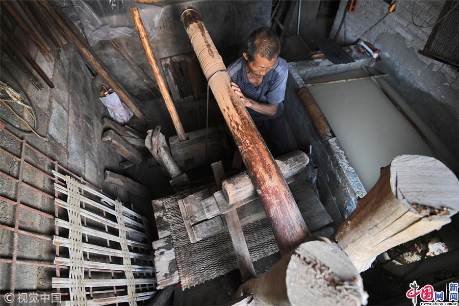 2018年6月24日,在贵州省黔东南岑巩县白水村,65岁村民黄仕国在自家的作坊挤压刚刚制作好的火纸的水分。(视觉中国)