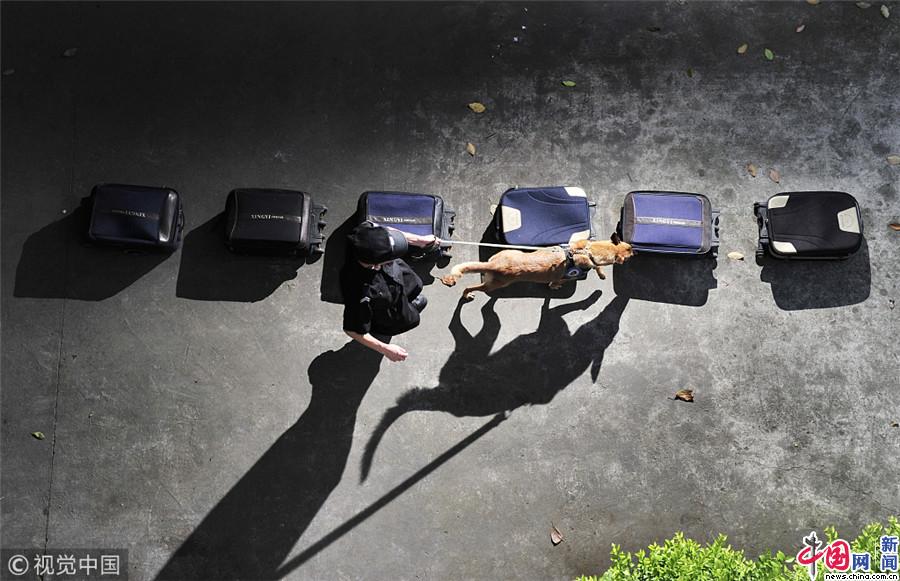 2010年6月25日,成都市公安局刑警支队警犬大队,缉毒犬的真实生活探秘。茶楼里的角落,成堆的皮箱的,食品仓库都成了缉毒犬的训练课堂。(视觉中国)