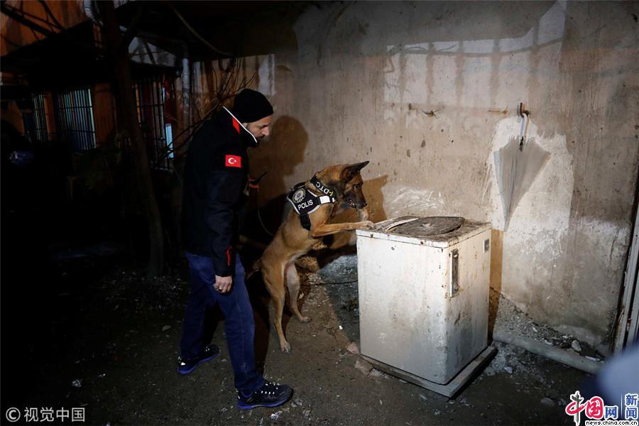 当地时间2018年1月16日,土耳其伊斯坦布尔,土耳其缉毒警察参与搜毒行动。(OSMAN ORSAL/视觉中国)