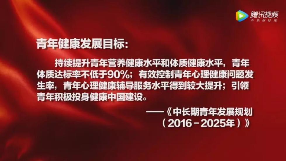 2017年4月,中共中央、国务院印发《中长期青年发展规划(2016-2025年)》,确立了青年健康事业的发展目标:持续提升青年营养健康水平和体质健康水平,青年体质达标率不低于90%;有效控制青年心理健康问题发生率,青年心理健康辅导和服务水平得到较大提升;引领青年积极投身健康中国建设。