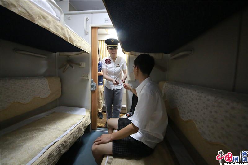 2018年6月28日,开车后,列车长王益在软铺进行查票工作。