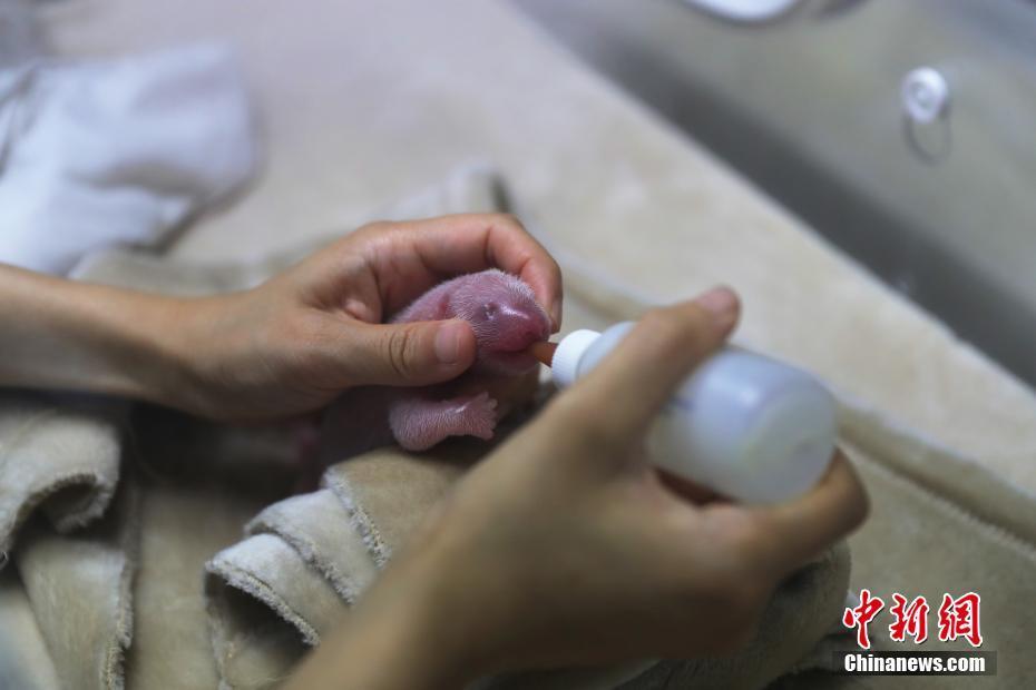 给新生的大熊猫宝宝喂奶。崔凯 摄