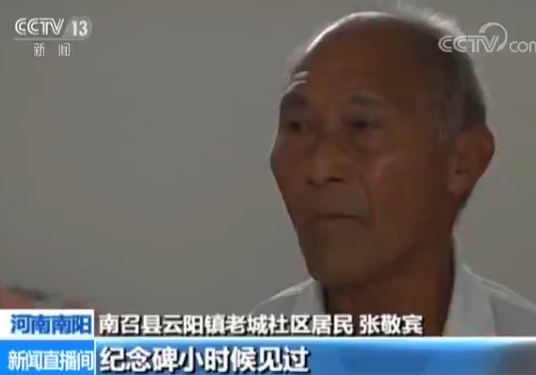河南省南阳市南召县云阳镇老城社区居民 张敬宾:纪念碑小时候见过,南边的碑文写的是抗日烈士纪念塔,有气壮山河(几个字),反正是好几个(碑),是砖砌的梯塔,大约有三丈多一点高。