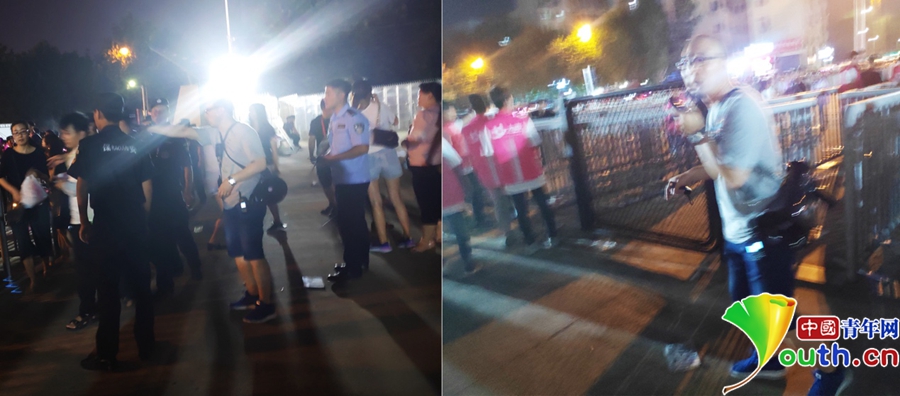 当晚八点开唱,九点半依然有黄牛混迹在安检口,试图“闯关”。图为老段和黄牛在斗争。