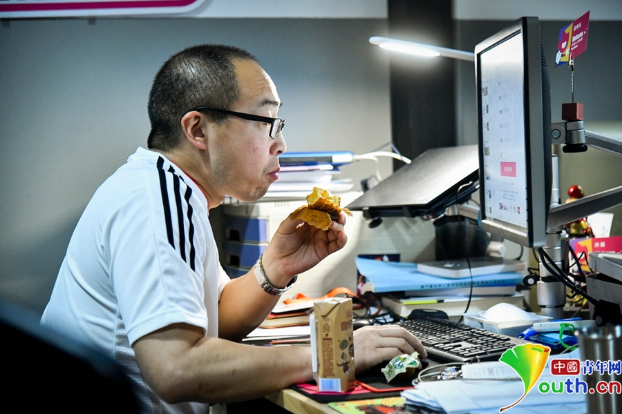 跑惯了现场,养成了饭凑合吃的习惯。“这比在现场好多了。有一年端午节,几个同事去外地现场,火车上每人一盒方便面就过节了,大家在一起,感觉不出苦。” 摄影/徐成