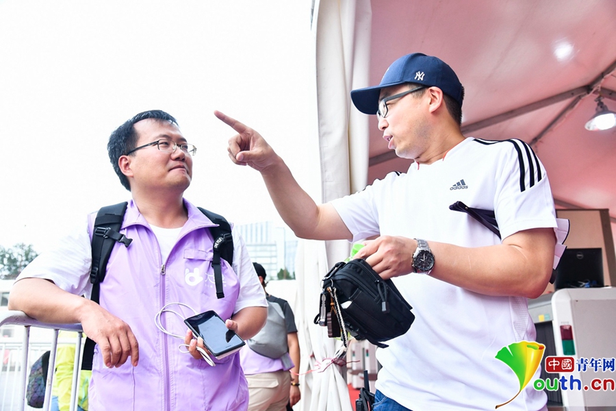 老段在一旁给新同事传授经验。有一年在天津的一个演唱会在场,一个女生的票纸损坏了,为了核实该票的真实性,老段电话了客服查验了票码,并现场核实了用户的信息,才放行。摄影/徐成