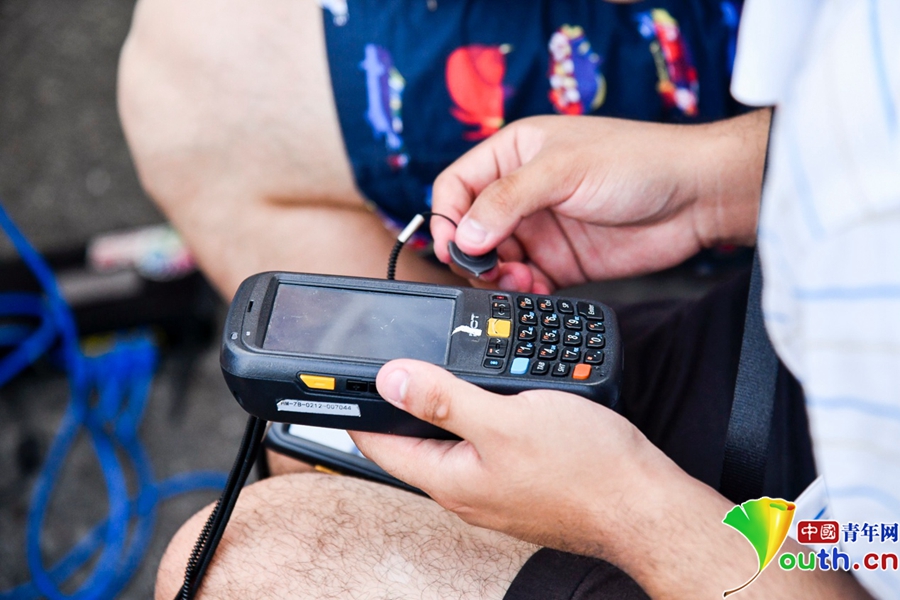 为了防止黄牛扰乱秩序,假票鱼目混珠,验票现场一般会设置了三重关卡。第一关安保人员粗检,粉丝凭票入场;第二关大麦网PDA扫票纸芯片验证入场,第三关,针对看台入口及内场看台入口进行对应区域票品验证。这样的设计也给老段和票务人员减轻了不少压力。图为工作人员在调试PDA。摄影/徐成