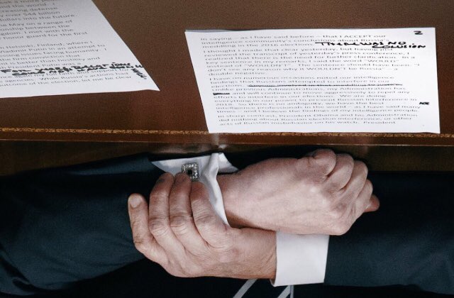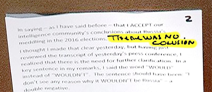 当地时间17日,特朗普就“美俄首脑会晤”发表讲话,接受美国情报部门“俄罗斯涉嫌干预美国总统大选”调查的结果,但否认俄罗斯的行为对大选结果有影响。记者拍到特朗普的演讲稿,大写黑色标注的笔记“没有勾结”。但是,单词拼写错了。