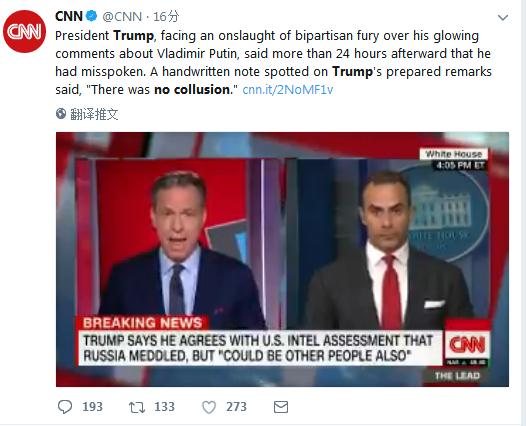 美国有线电视新闻网17日报道称,特朗普总统因关于弗拉基米尔 普京的热情洋溢言论遭到两党猛烈抨击,在24小时后表示,他说“口误”了。特朗普表示“我说了would而不是wouldn’t,我想说的是我看不出有什么理由不是俄罗斯干的”。