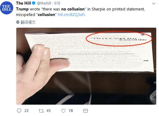 在特朗普事先准备好的讲话稿中,记者拍到特朗普大写黑色标注的笔记“没有勾结”。单词还拼写错了,把写成了“ collusion”写成了“colusion”。